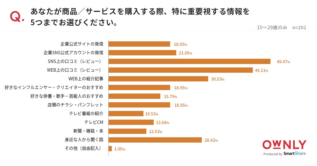 「Z世代(15歳から29歳までの世代)」に対して、商品・サービスを購入する際の重要視する情報として「SNS上の口コミを参考にする」回答が最も多く、49.47%という結果に。
