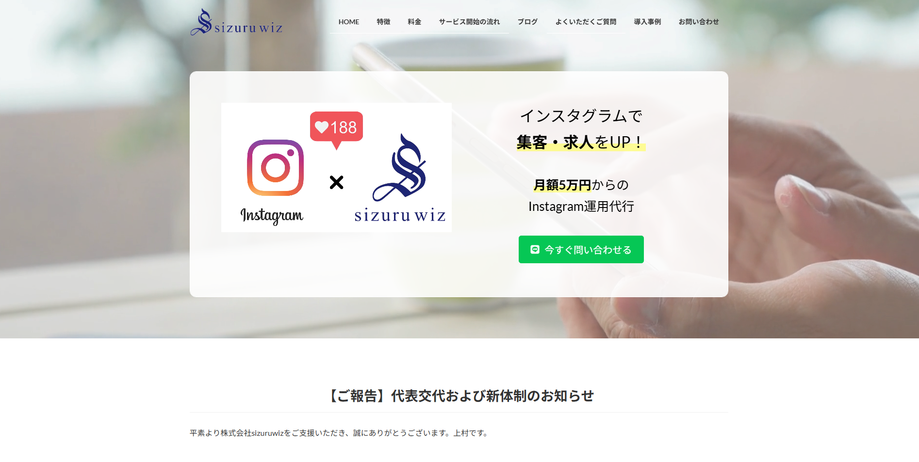 sizuru wizは、月額5万円から導入できるInstagram専門の運用代行サービスです。