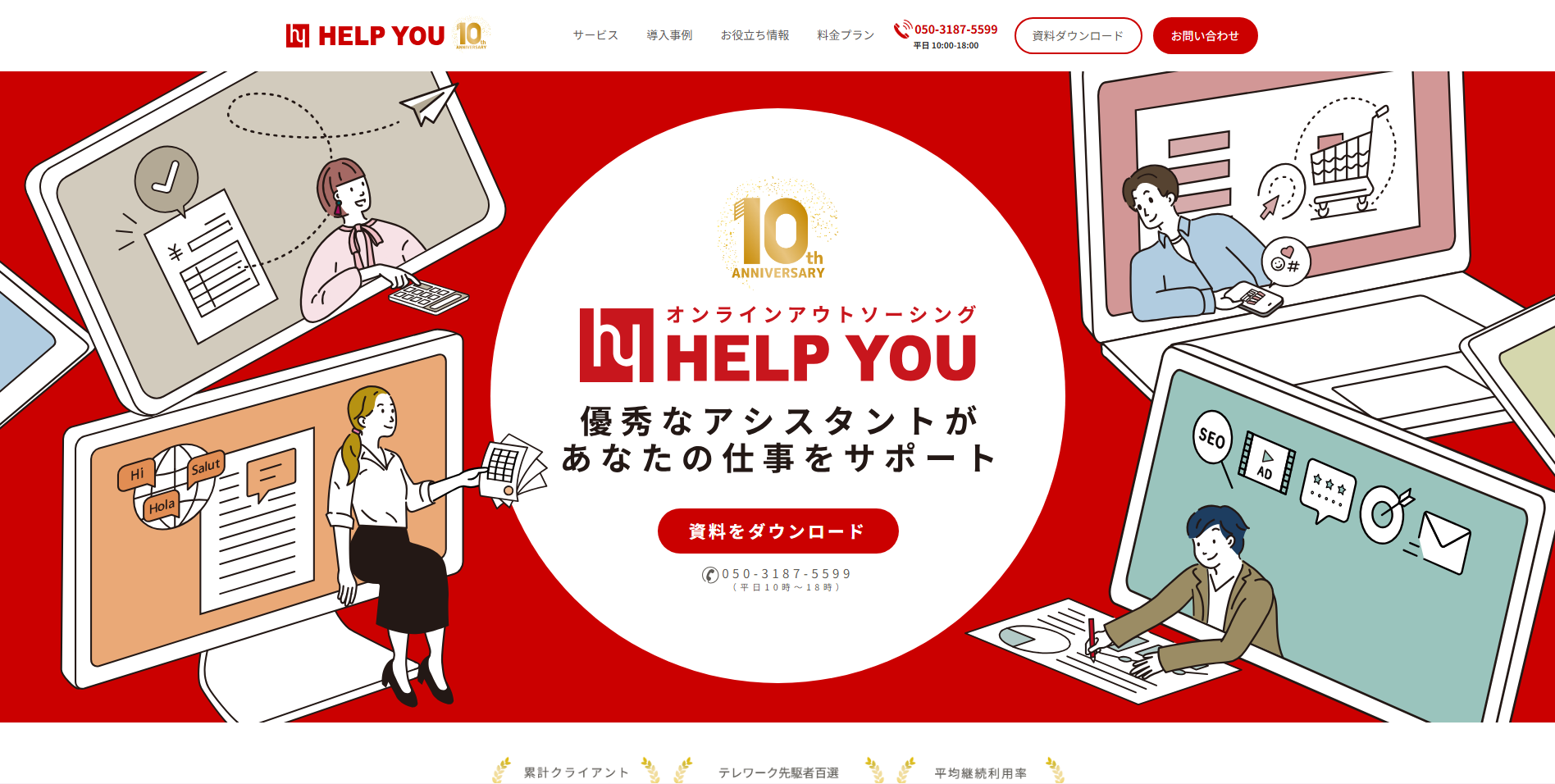 株式会社ニットが運営するHELP YOUは、オンラインでアシスタントが業務を代行するアウトソーシングサービスです。
