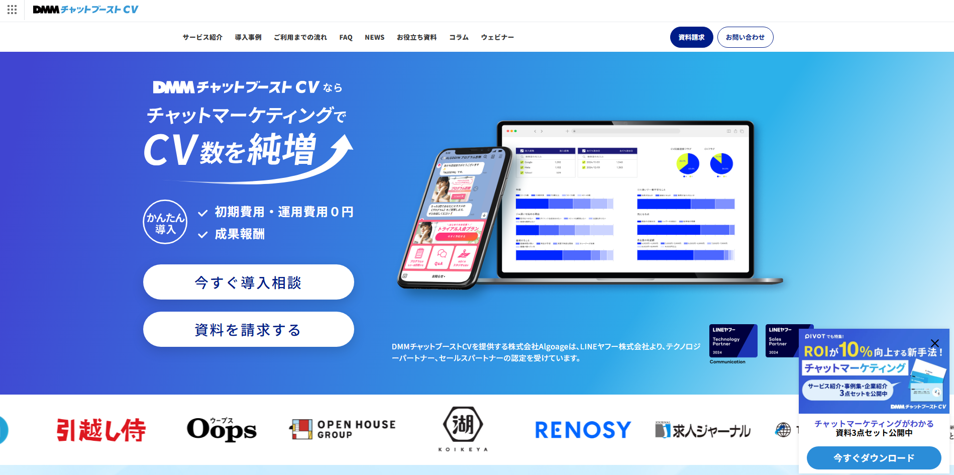 LPを離脱したユーザーに対してポップアップを表示し、LINEを起点とした1to1コミュニケーションへとつなげる独自の導線設計が特徴です。