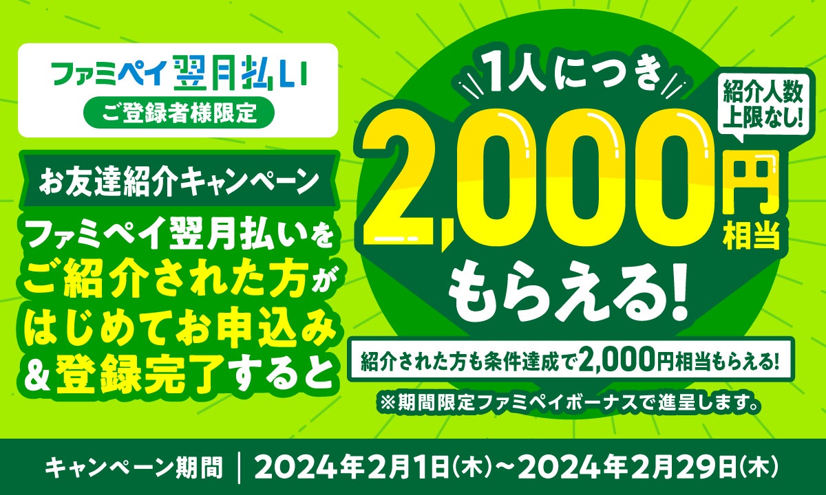 ファミペイ翌月払いを登録中のユーザーが、お友達にファミペイ翌月払いを紹介すると、紹介した側・された側の両方に2,000円相当のファミペイボーナスが進呈されます。