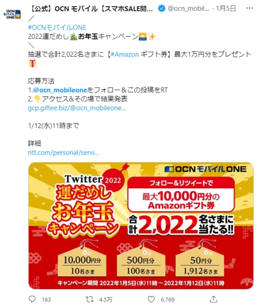 はじめに紹介するのは、OCNモバイルが8日間実施した「ONE Twitter 2022運だめしお年玉キャンペーン」です。
